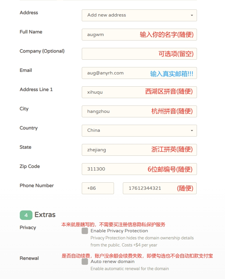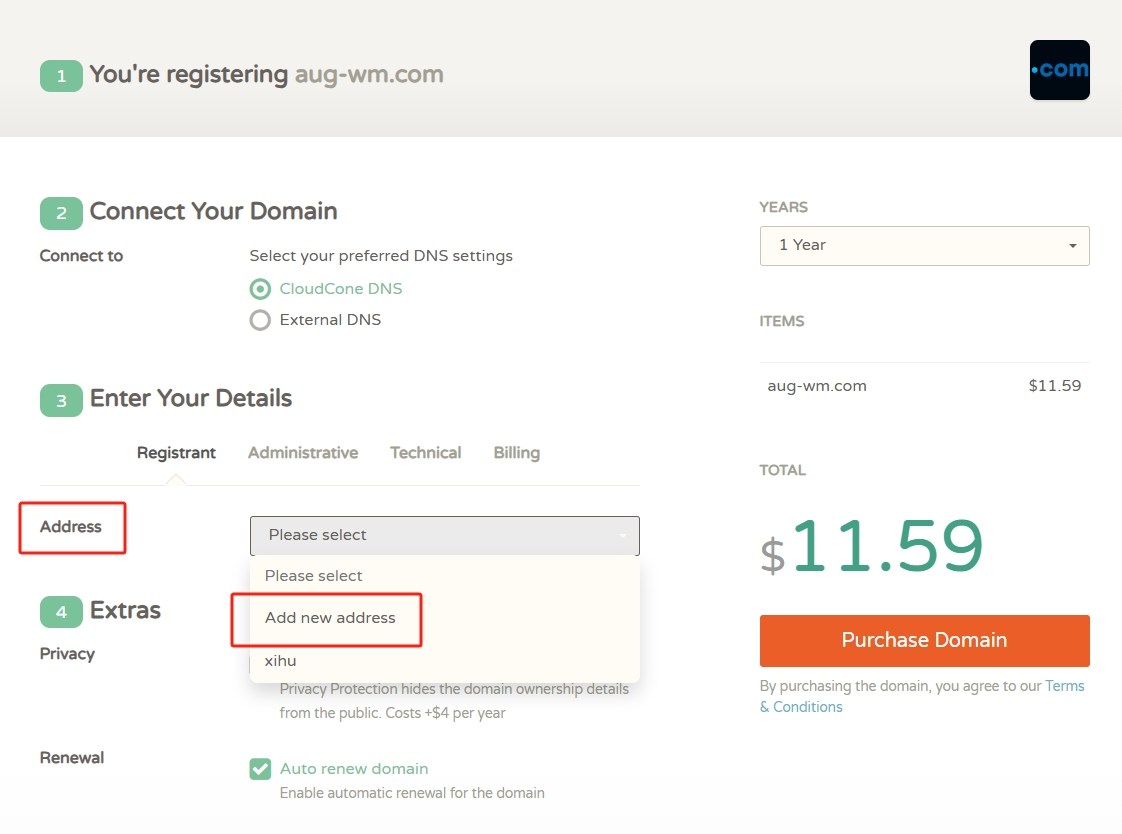 在新打开的域名注册资料填写页面,我们先在 Address 处选择 “Add new address” 新创建一个注册信息,如果你注册过多次,那也可以使用旧的信息。