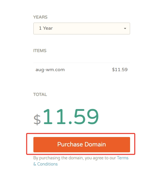一切都填写完成后,我们就可以点击右侧的 “Purchase Domain” 按钮进行付款和注册了。