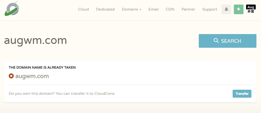 我们继续访问 https://app.cloudcone.com.cn/domain/search 前往域名注册域名,直接在地址栏输入我们想要注册的域名,例如搜索 augwm.com (寓意:Aug外贸),点击搜索(SEARCH)后可以看到是红色X提示,那就是被注册过了,这个域名被别人持有了。