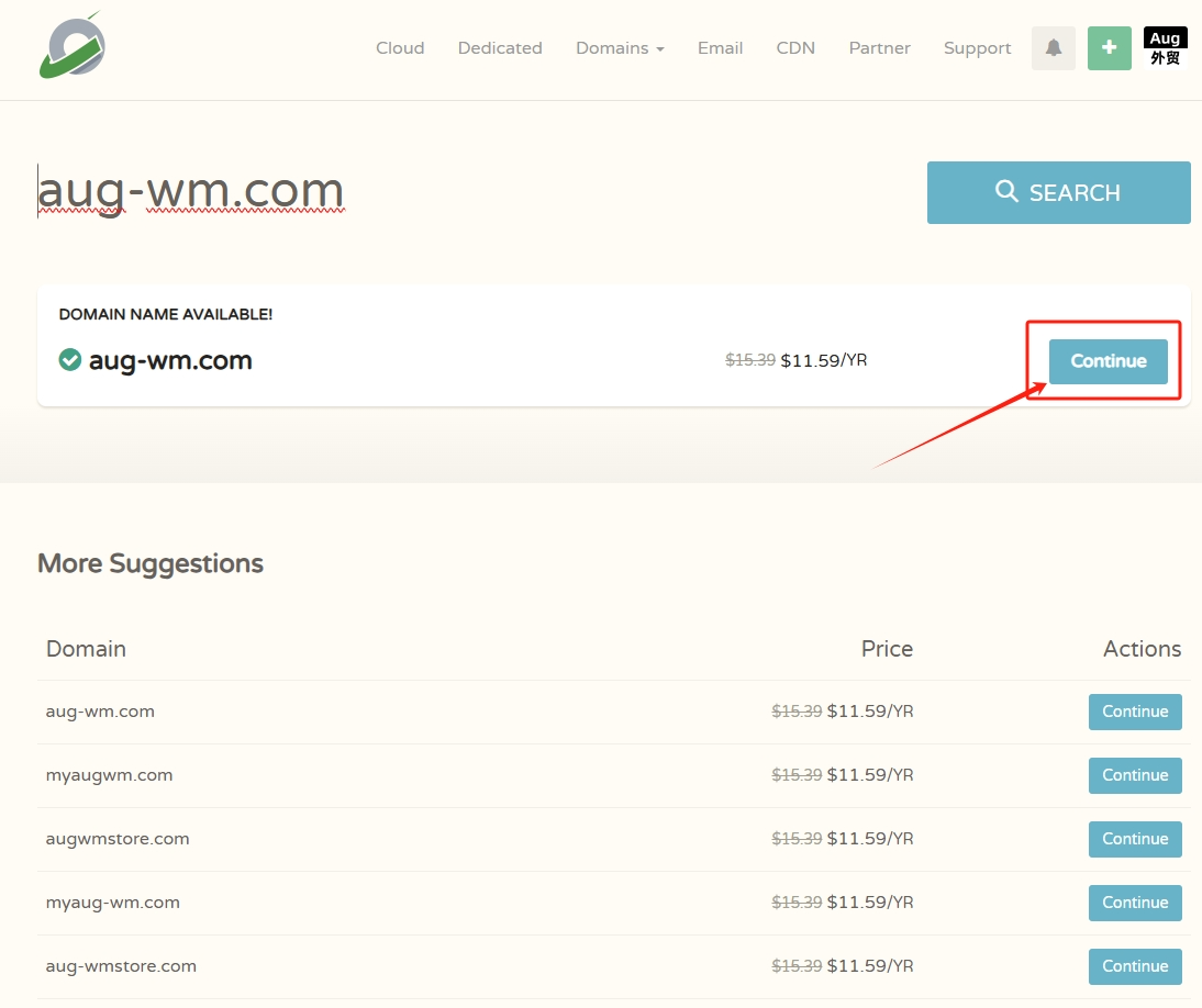 现在我们只能更换一个尝试,那就简单的在中间加了一个横杠吧(你也可以更换其他纯字符尝试)。我们输入 “aug-wm.com” 重新搜索一下,可以看到这个没有被注册。那我们就点击右侧的 “Continue” 注册这个吧!