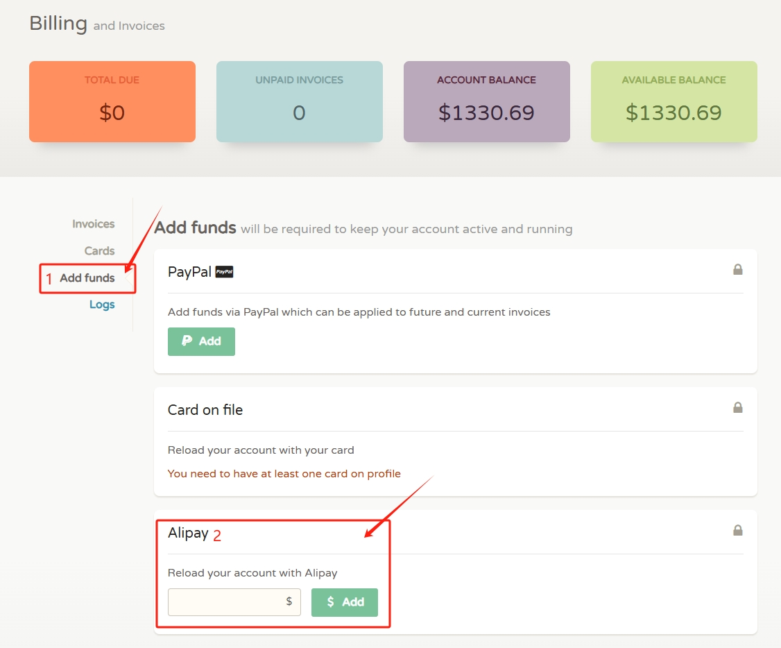 然后,通过访问 https://app.cloudcone.com.cn/billing#cloud-credit 后,在支付宝处输入要充值的金额,之后点击Add,就可以支付宝扫码付款了。
