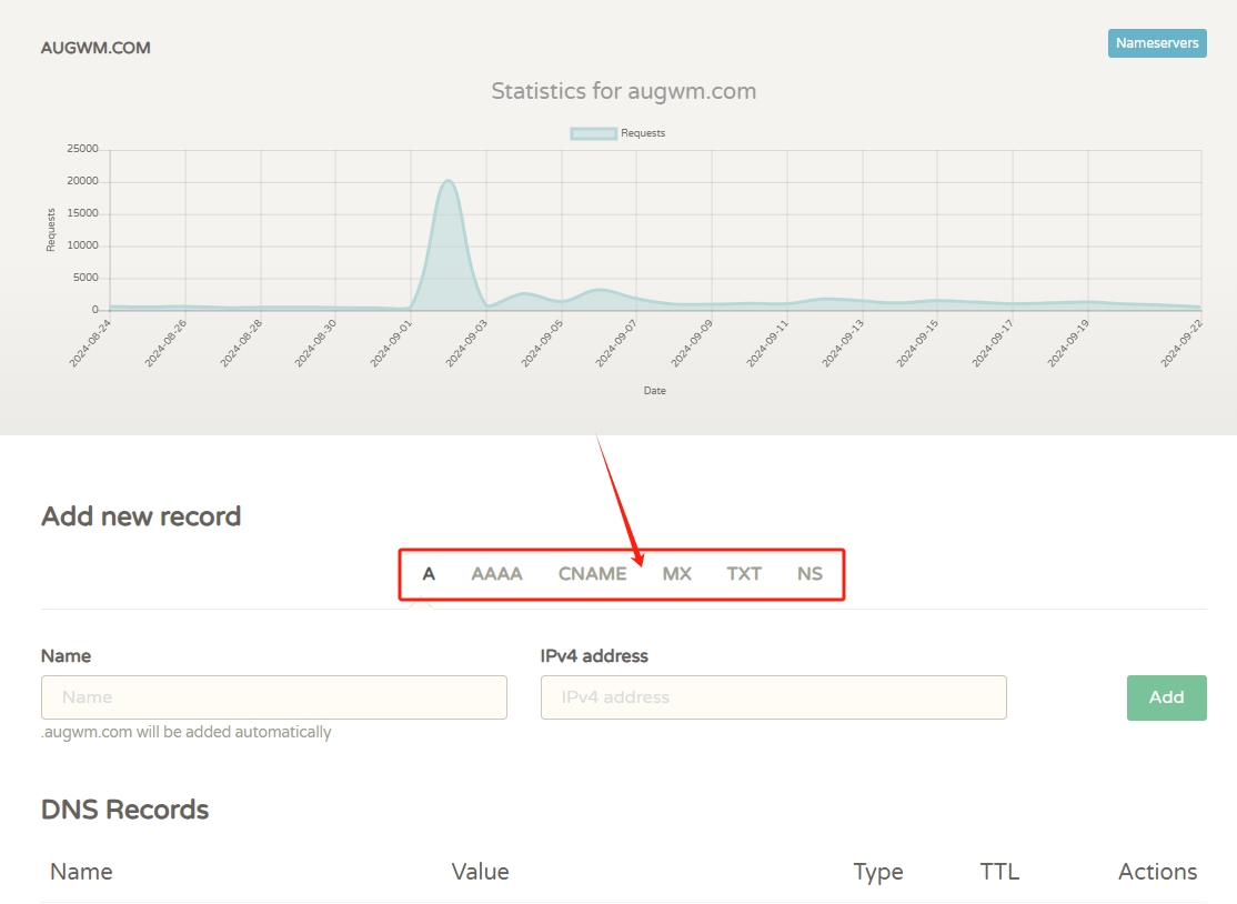 下面的页面就是域名解析处页面了,正下方我们可以看到有A记录、AAAA记录、CNAME记录、MX记录、TXT记录和NS记录。我们就可以按照服务商的要求去进行对应的记录配置了。