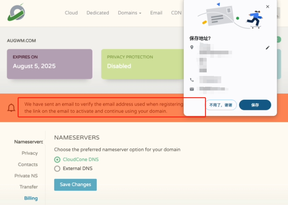 那么我们从CloudCone注册域名相比在阿里云和腾讯云相比,有什么好处呢?第1个好处就是CloudCone注册资料可以随便写,主要你的验证邮箱写对,其他都是随便的,这样就很难让有心之人通过WHOIS查找我们的个人信息。第2个好处是简约的DNS管理界面,不像大厂那么花里胡哨的复杂。第3个好处就是支持自定义DNS解析服务商,如果你不喜欢简约的解析管理面板,CloudCone允许你把域名的解析服务转移到CloudFlare、DNSpod等平台。