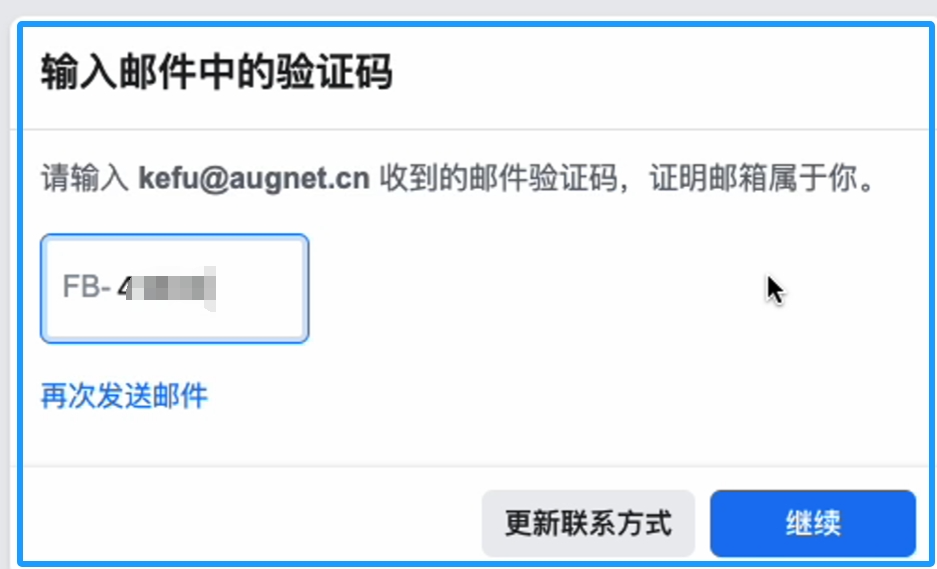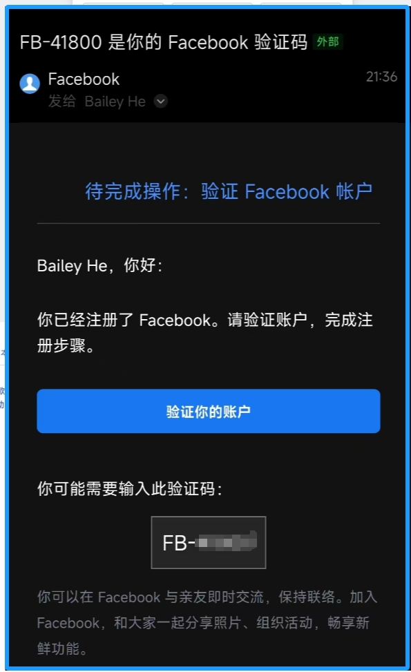 好啦最后我们点击注册就会收到一封Facebook发到邮箱的验证码。如果你未收到验证码,请检查垃圾箱。