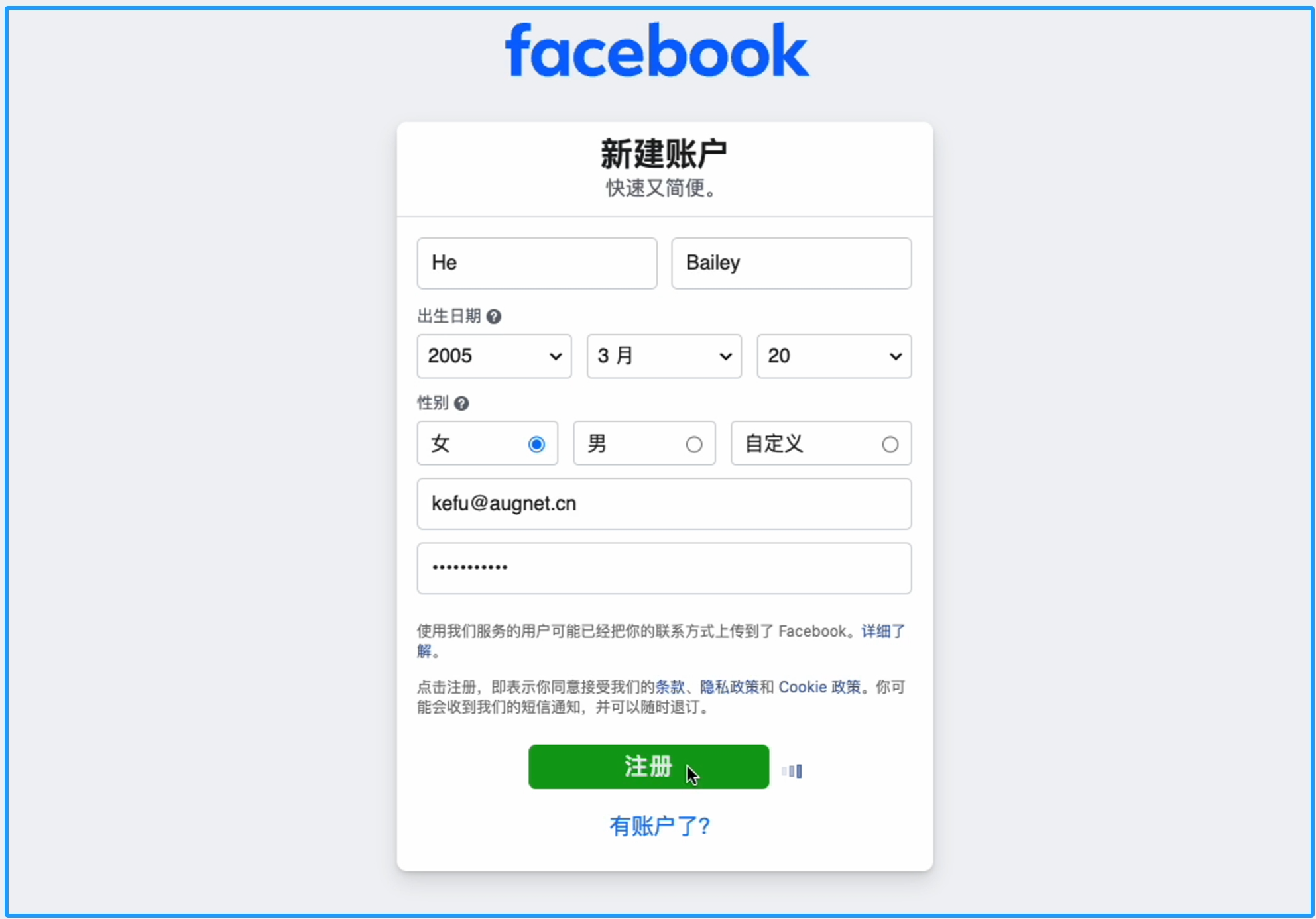 出生日期,我们正常填写即可。如果你要随便写,那你一定要记住你写的日期,后续Facebook有可能会跳验证让你输入你的生日,假如你到时候想不起来,那真的是“秋后谈恋爱———早晚要凉了”。