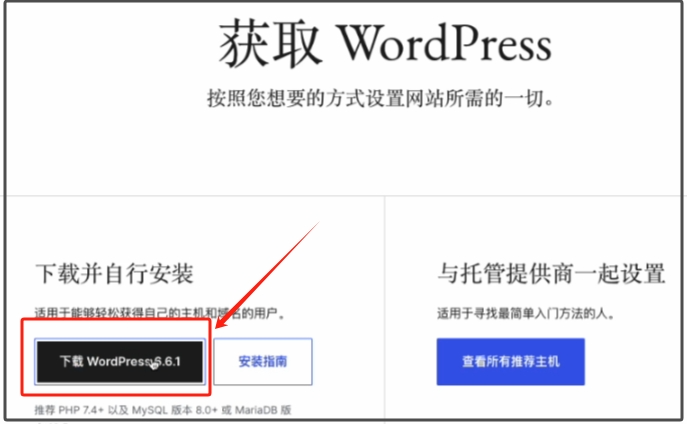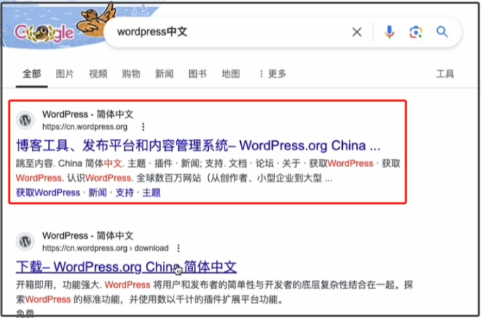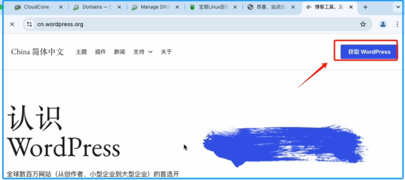 我们就需要安装独立站程序了,也就是常用的WordPress,我们在浏览器搜索WordPress中文,我们点进去第一个,点击右上角的获取WordPress,再在新的页面点击左侧的下载即可。