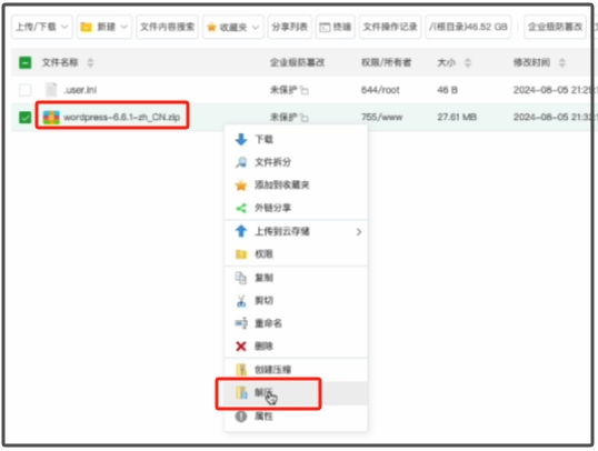 上传完成以后,选择文件,点击右键找到“解压”,解压这个WordPress安装压缩包。