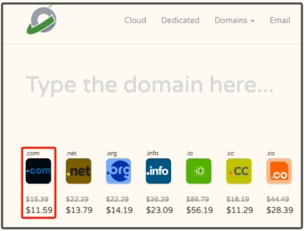 输入我们的cloudcone账号密码登录以后,在上方的导航栏找到domains,接着点击register domain,可以看到com域名是11.59美元