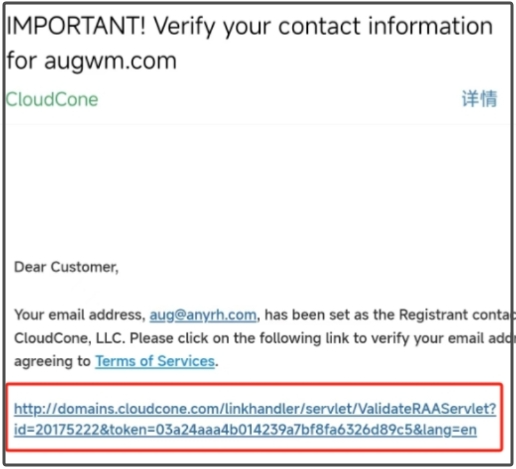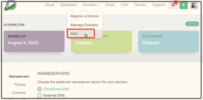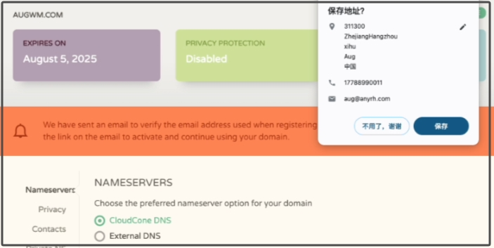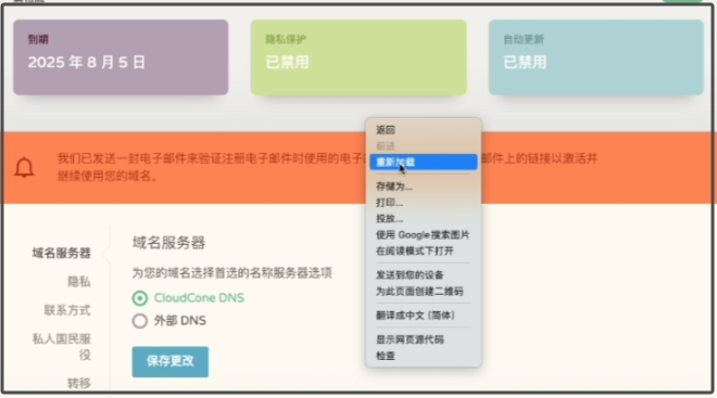 返回到cloudcone注册域名的管理页面,我们右键刷新页面就可以看到红色横幅通知已经没有了。