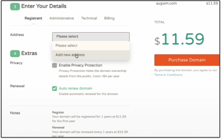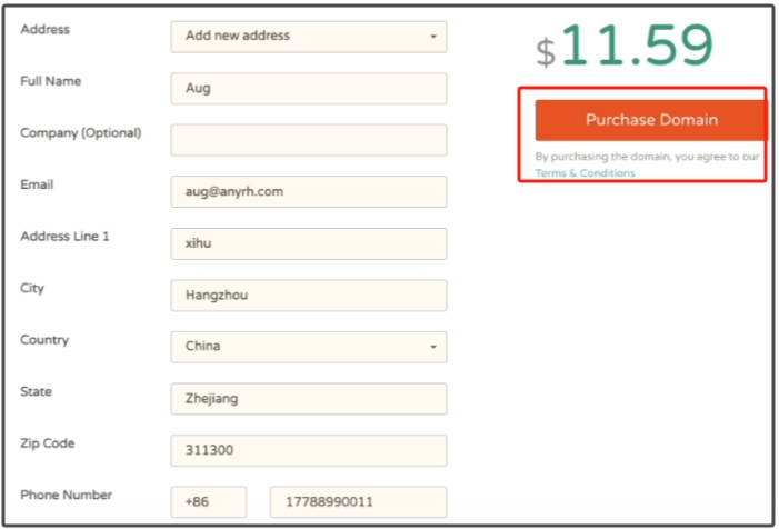 全部搞完以后,我们就可以点击右侧的“Purchase Domain”按钮注册域名了。