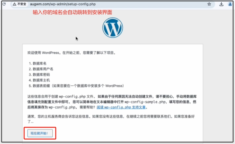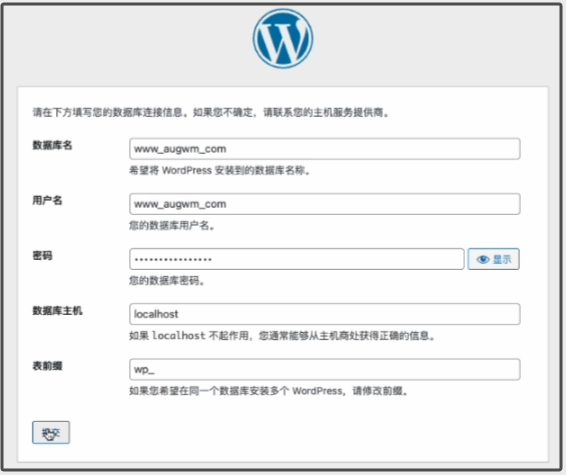 我们直接点击“现在就开始!”进行Wordpress的安装调试,点击以后进入下图,我们输入数据库名、用户名、密码,这3个数值我们可以在宝塔面板的“数据库”标签页处看到。如下图2