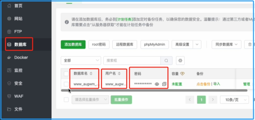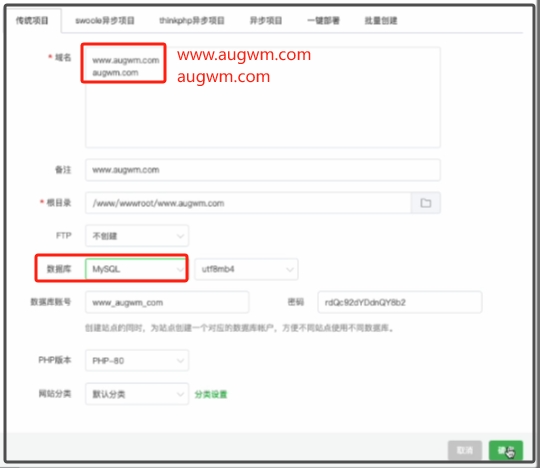 输入我们刚刚注册的域名地址 www.augwm.com 然后按回车换行,再输入augwm.com 这里就算是绑定2个域名完成了。在下面的数据库我们选择MySQL,其他默认即可,最后点击确定,即创建了一个网站。