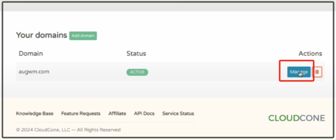 找到我们需要管理的域名,点击右侧的“Manage”按钮进行域名DNS解析管理。
