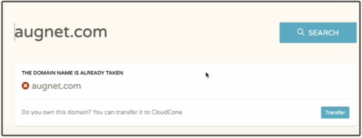 之后我们输入要注册的域名,Aug外贸博主这里输入了augnet.com,发现无法注册,已经被别人抢注了。