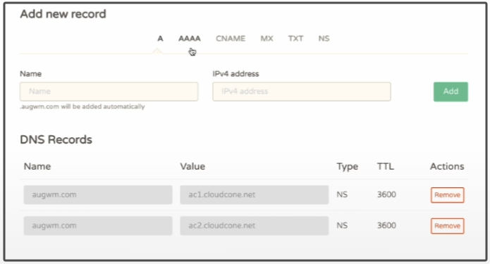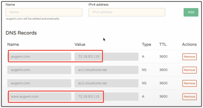 然后再返回到刚才域名的DNS管理处,在第一条a记录在name处填写@,在第二个IPV4框中粘贴刚才的IP地址。之后点击右侧的添加ADD。然后设置第二条DNS地址,我们输入www,IPV4处还是粘贴刚才的IP地址。最后添加域名的设置已经完成了。