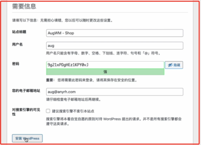 之后按照下图,输入要填写的内容即可。站点标题后续是可以修改的;用户名就是你网站管理员名字,自行设置;密码可以默认也可以自己想一个填进去;电子邮箱地址输入自己常用的邮箱;最后点击“安装WordPress”。