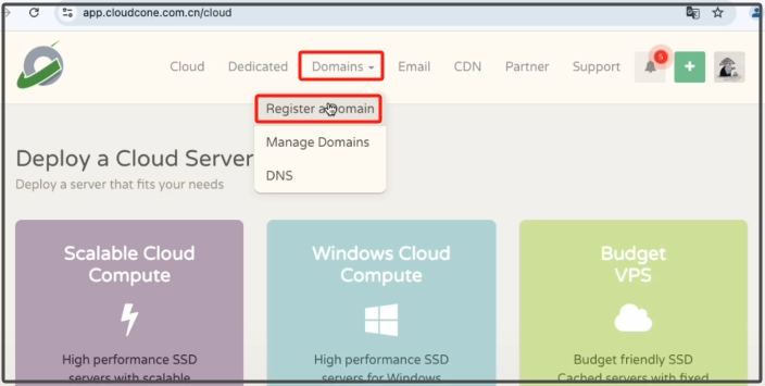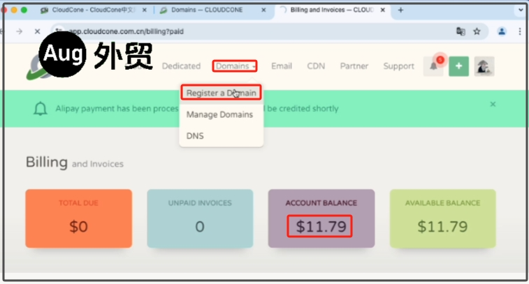 现在可以看到我们cloudcone的余额已经是11.79美元了。我们再点击导航栏的Domains > Register a Domain