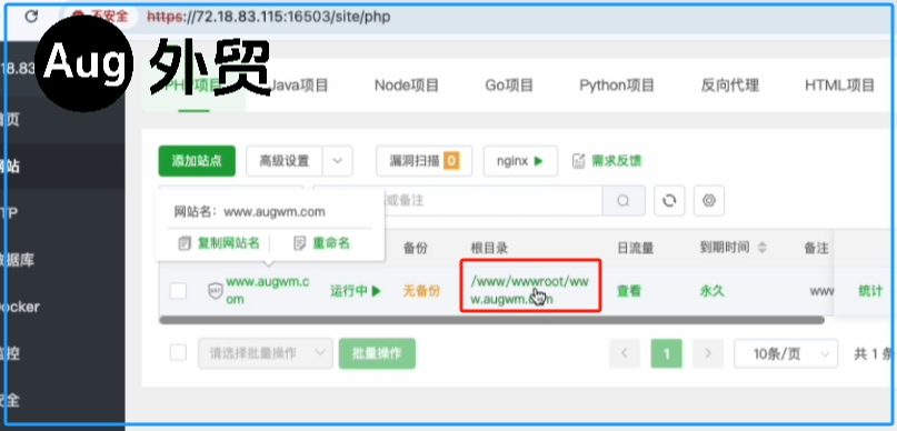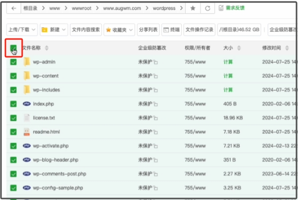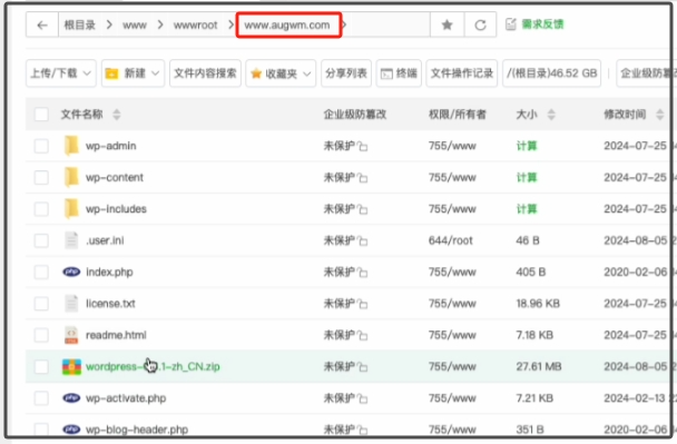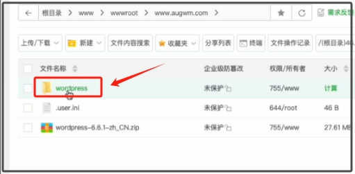 注意,是将Wordpress里边的那些文件,如上图。剪切、粘贴到下图的目录。 【根目录>www>wwwroot>www.augwm.com 】,一切不要见剪切错了。如果是你自己注册的域名,那就是 【根目录>www>wwwroot>你的域名 】。