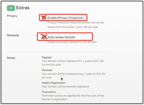 填写完了地址信息以后,我们继续往下看,一个是隐私服务+4美金每年,我们本来就是瞎写的,所以不需要购买。第二个就是自动续费,我们也点击取消。实际上,我们cloudcone账户没钱,他也没法自动续费的。