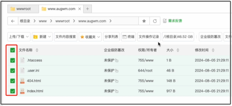 现在我们点击这个网址根目录,进入管理网站文件,全选这里的默认文件,然后删除这些文件。