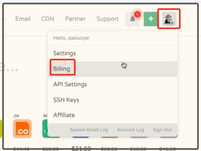 如果你按照我上一期教程进行,提前预存好了足够的余额,那就可以直接注册购买域名了。Aug外贸博主这里没有预存好余额,所以我们现在要预存一下余额了。点击右上角的头像,再点击Billing进入账户金额管理。