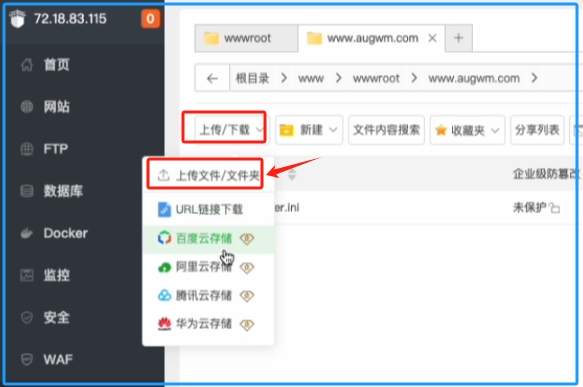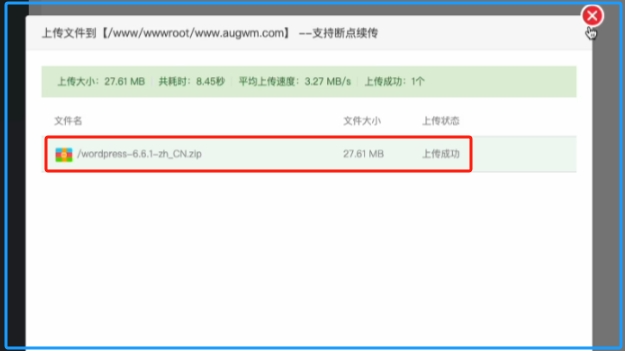 返回到网站服务器的宝塔界面,点击上传或下载,再点击上传文件,找到刚才下载的wordpress安装压缩包,最后点击开始上传。