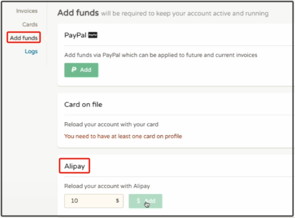 我们点击左侧的Add Funds ,选择ALipay也就是支付宝,输入10美金(因为博主账号还有一点几美金,如果你没钱就充值12美元),接着再点击绿色按钮add,之后就是支付宝扫码了。