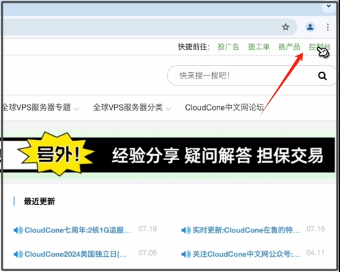 我们继续上次打开cloudcon中文网,大家可以搜索也可以直接访问,进入cloudcone中文网以后,找到网页右上角的控制台,进行前往。